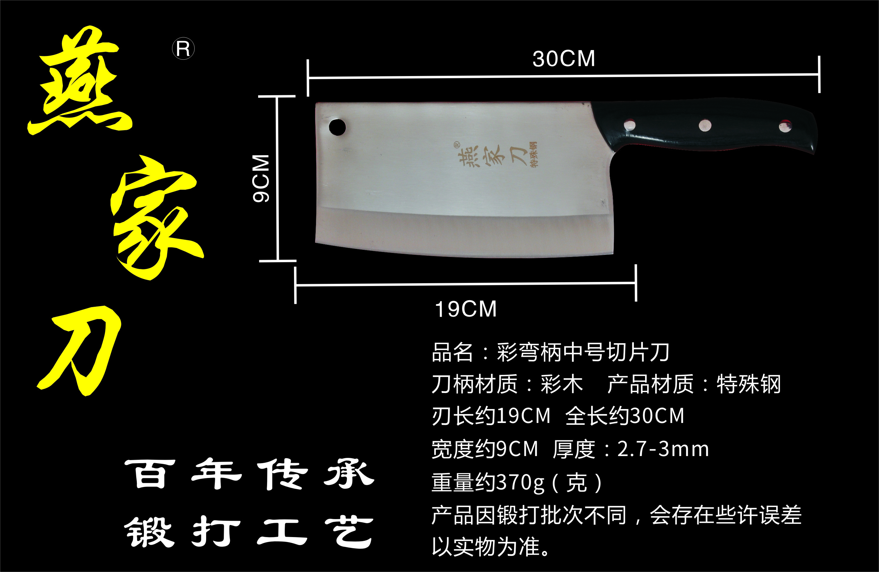 樂山燕家刀具有限公司(公司前身為燕佳鐵匠鋪),公司坐落于美麗的佛都之鄉樂山嘉州,在全國各地有上千家代理經銷點,公司專業銷售、設計、制作各類刀具。秉承一貫鍛造三精要求,即選料精、用料精、工藝精。所選材料全部產自滇東鐵礦優產區。本品牌刀具堅持千挑萬選為材,千錘百煉為刀的手工鍛造工藝宗旨。具有鋒利耐磨、持久耐用,用料上乘,硬度高、韌度強的特點!